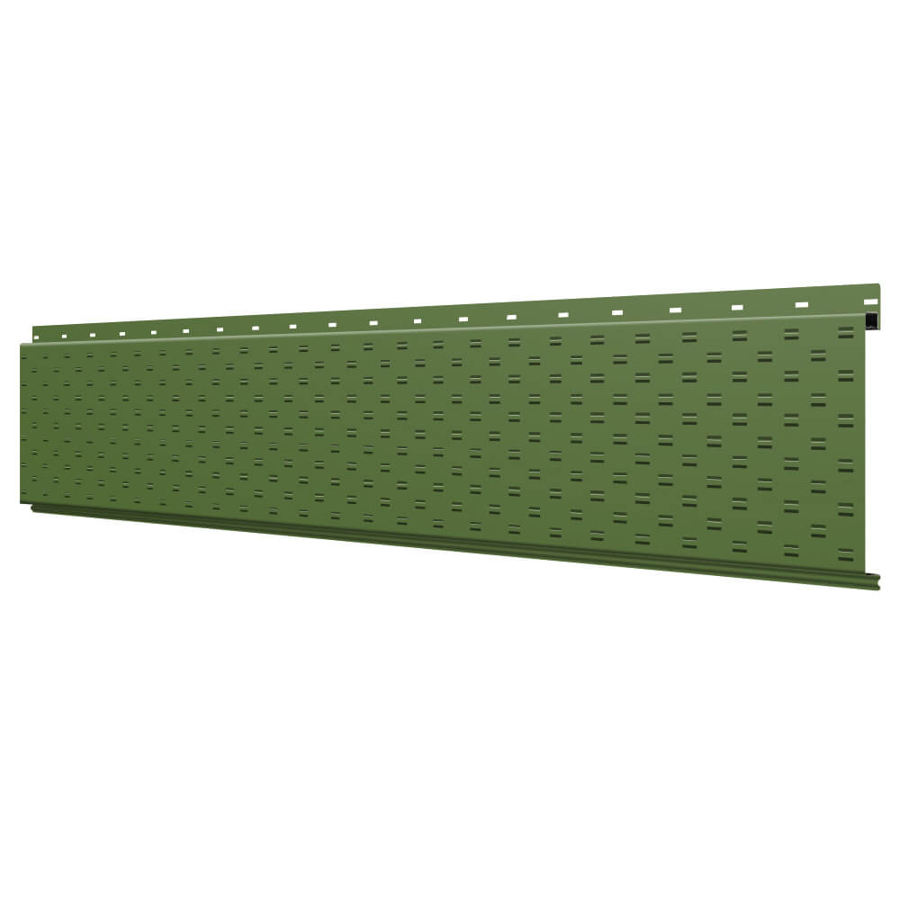 Линеарная потолочно-стеновая панель с ПЕРФОРАЦИЕЙ для вентиляции цвет RAL6002 Зеленый Лист применяется в качестве софитов для подшивы крыши, наружной и внутренней отделки потолков, стен, фронтонов фасада дома в Пензе.